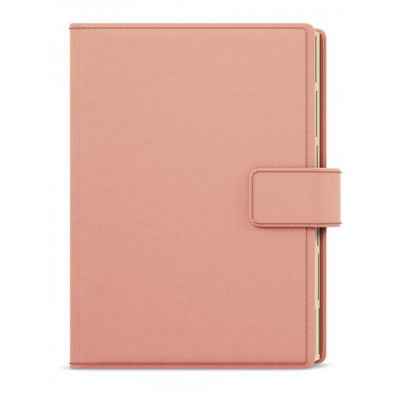Elegantní denní diář ve formátu A5 se stylovým a znovupoužitelným obalem v růžové barvě. Praktické vnitřní uspořádání nabízí množství přihrádek na vizitky, poutko na tužku a bezpečné magnetické zavírání. Diář bude působit luxusně a profesionálně – ideální volba pro práci, podnikání i osobní organizaci.