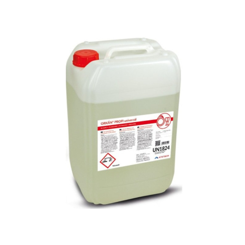 ORKÁN PROFI univerzál 17l je alkalický tekutý univerzální mycí detergent pro průmyslové myčky nádobí.
