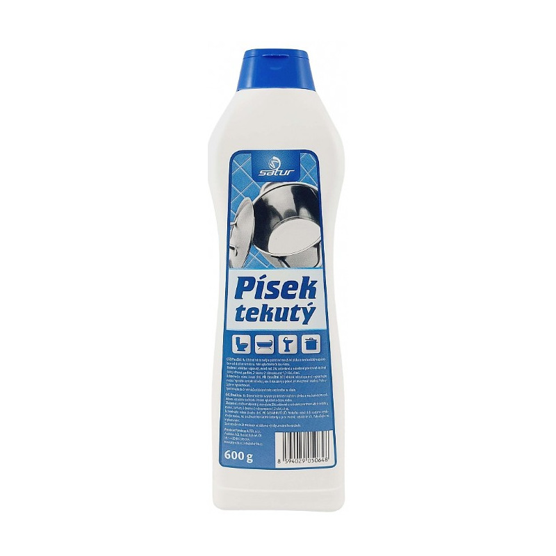 SATUR PÍSEK TEKUTÝ je krémový abrazivní čisticí prostředek vhodný na čištění umyvadel, van, nádobí, obkladů a WC. Přípravek je parfemován jemnou citronovou vůní.