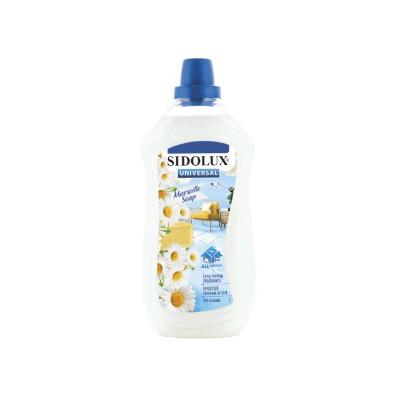 Sidolux parfemovaný univerzální čistící prostředek na všechny omyvatelné povrchy a podlahy s vůní Marseillského mýdla. Bohatá a přitom jemná vůně marseillského mýdla s lehkým nádechem heřmánku a jasmínu.