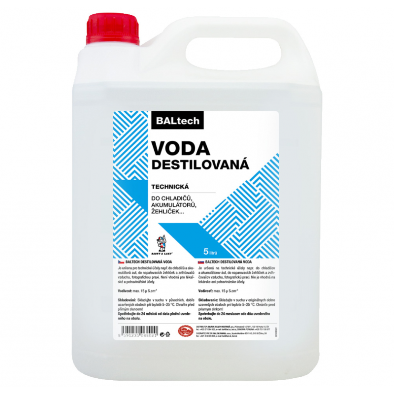 Destilovaná voda je určena pro technické účely např. do chladičů a akumulátoru aut, do napařovacích žehliček a zvlhčovačů vzduchu, fotografickou praxi. Vodivost max. 15 µ S.cm-1