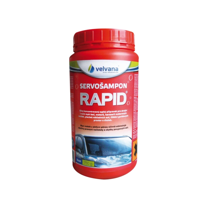 SERVOŠAMPON RAPID je modrý sypký prášek příjemné vůně. Jedná se o speciální směs povrchově aktivních látek, emulgátorů, smáčedel, dispergantů, alkálií, parfému a barvy.