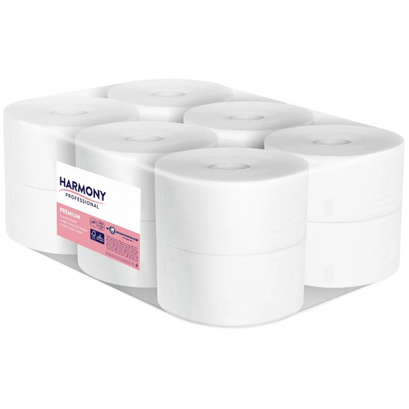 Toaletní papír HARMONY PROFESSIONAL PREMIUM JUMBO průměr 190 mm, 2-vrstvý, 100% celulóza, návin 117,5 metrů. Cena je uvedena za 1 ks, 12 ks rolí v balení.