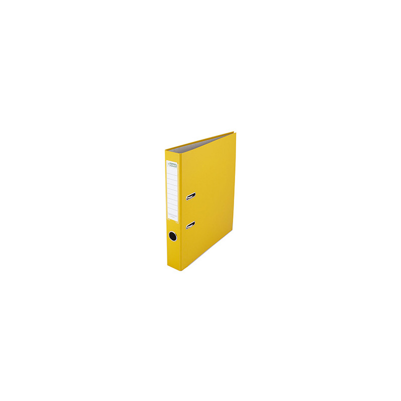 Pořadač pákový A4, 50 mm žlutý, z vnější strany polepen PVC, uvnitř papírem, oboustranný vyměnitelný popisový štítek. Spodní hrany pořadače chrání kovová lišta, hřbetní otvor s kovovým lemem usnadňuje vyjmutí pořadače z police, otvory s kovovým lemem na přední desce plní funkci zámků, které drží pořadač uzavřený.