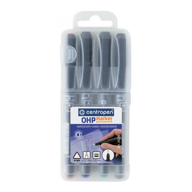 Popisovač CENTROPEN 2636 F OHP PERMANENT Marker je jeden z nejprodávanějších výrobků značky Centropen již po několik desetiletí. Je tak vhodnou volbou pro každého, kde potřebuje léty odzkoušený a kvalitní výrobek na většinu povrchů (fólie, sklo, porcelán, kov, film, fotky, plasty, ...). Ideální ke psaní a rýsování na transparentní fólie.