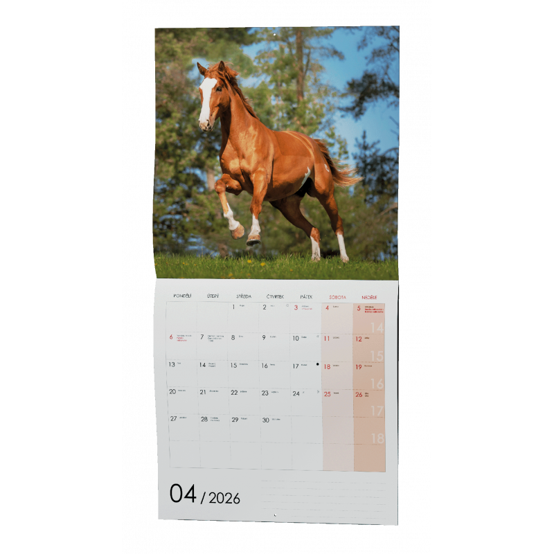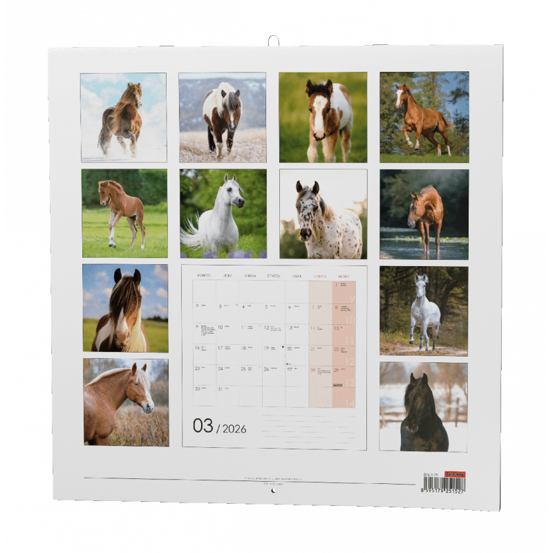 Nástěnný kalendář s měsíčním kalendáriem, v moderním formátu LP desky. Je věnován všem milovníkům koní.