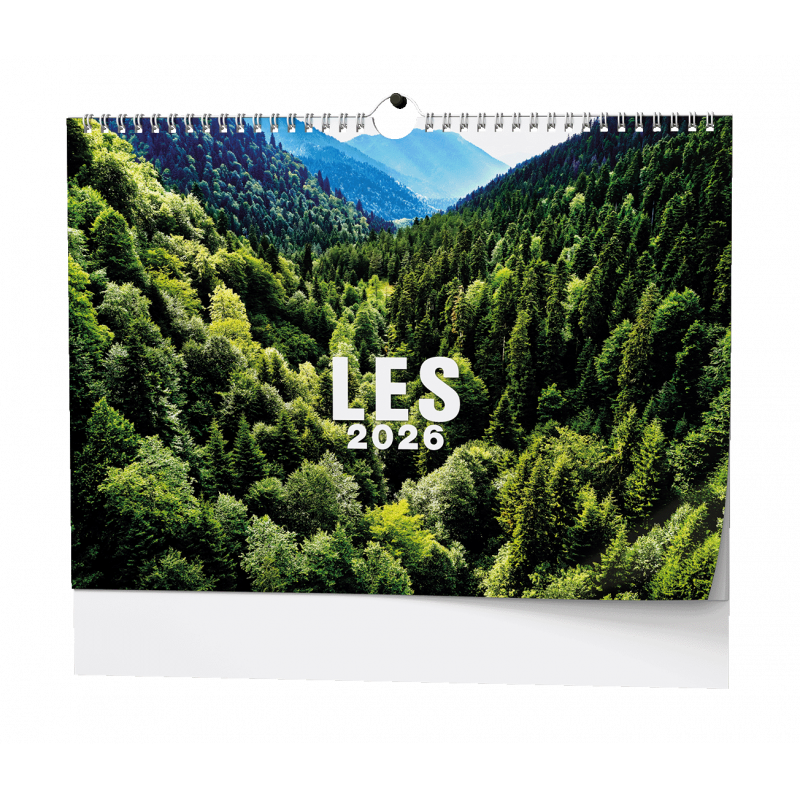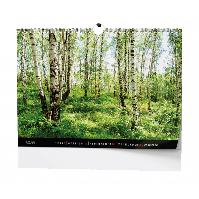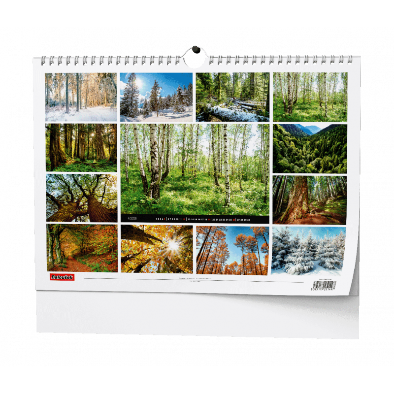 Nástěnný kalendář s obrázky působivých lesních scenérií.