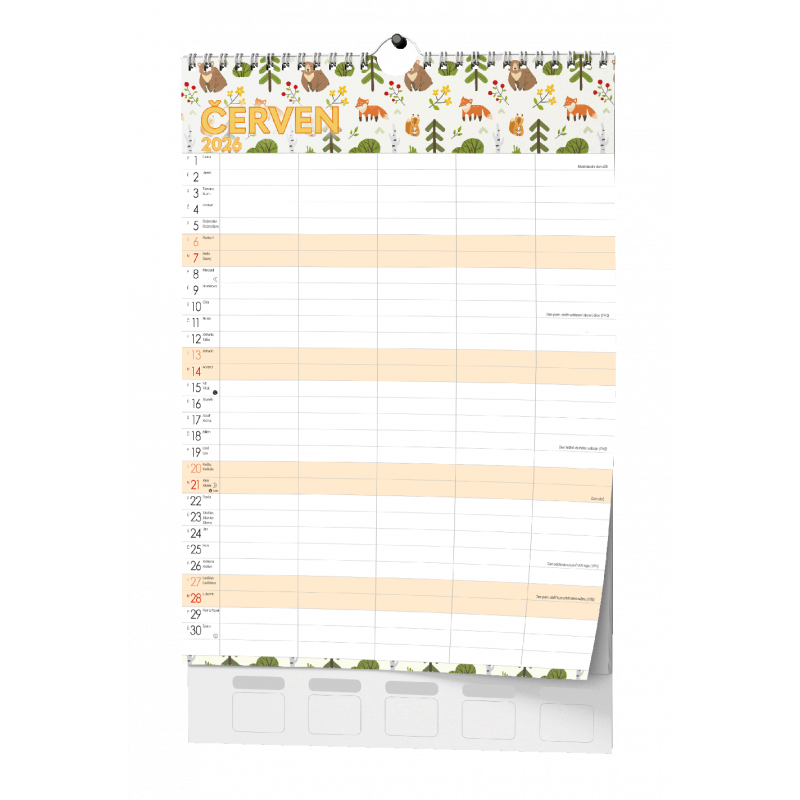 Přehledný nástěnný kalendář pro to správné rodinné plánování. Na zadním kartonu prostor na zapsání jmen jednotlivých členů rodiny (nemusíte přepisovat jména na každý měsíc) a velký prostor na poznámky.