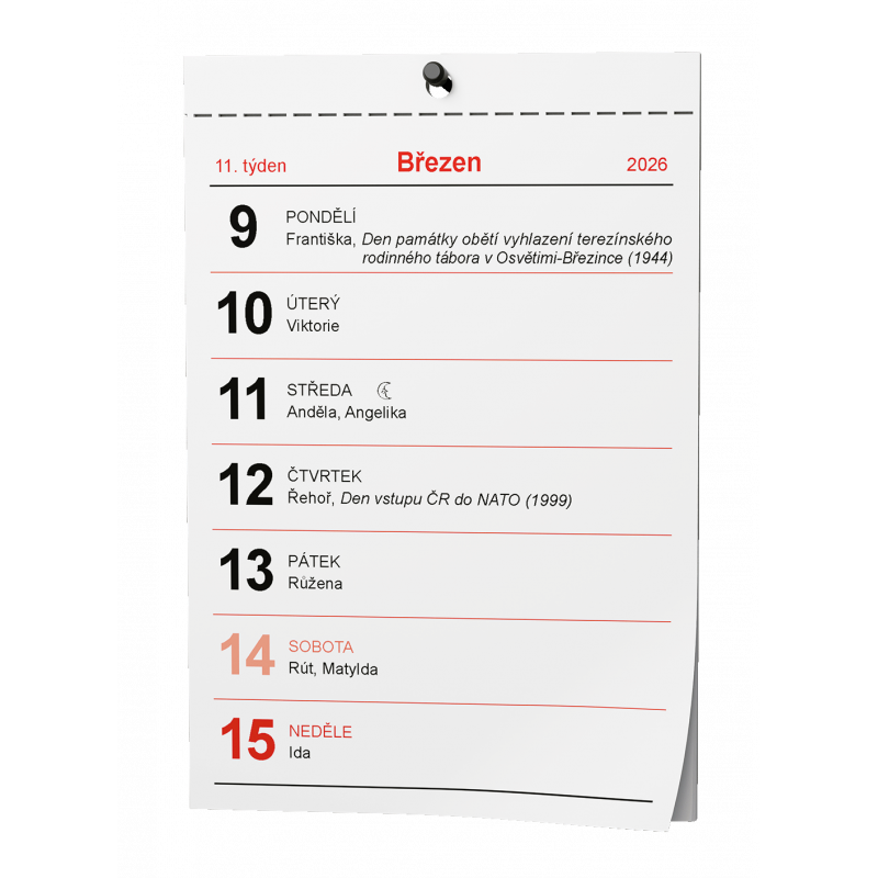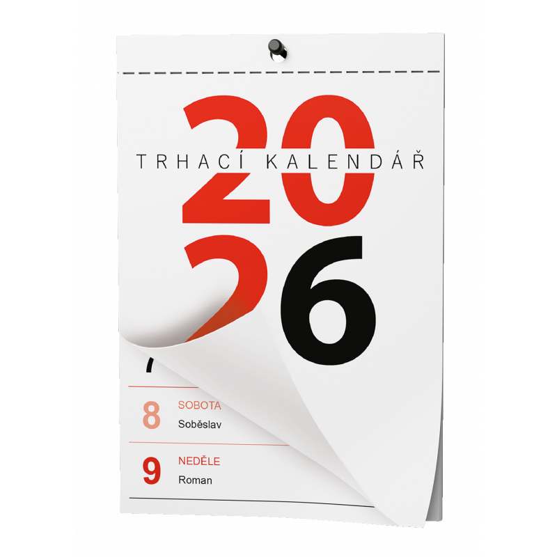 Trhací nástěnný kalendář s týdenním kalendáriem a většími písmeny a čísly ve formátu A6.