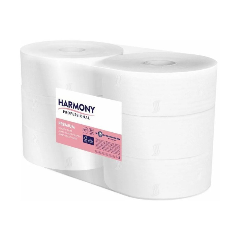Toaletní papír HARMONY PROFESSIONAL PREMIUM JUMBO průměr 280 mm, 2-vrstvý, 100% celulóza, návin 280 metrů. Cena je uvedena za 1 ks, 6 ks rolí v balení.
