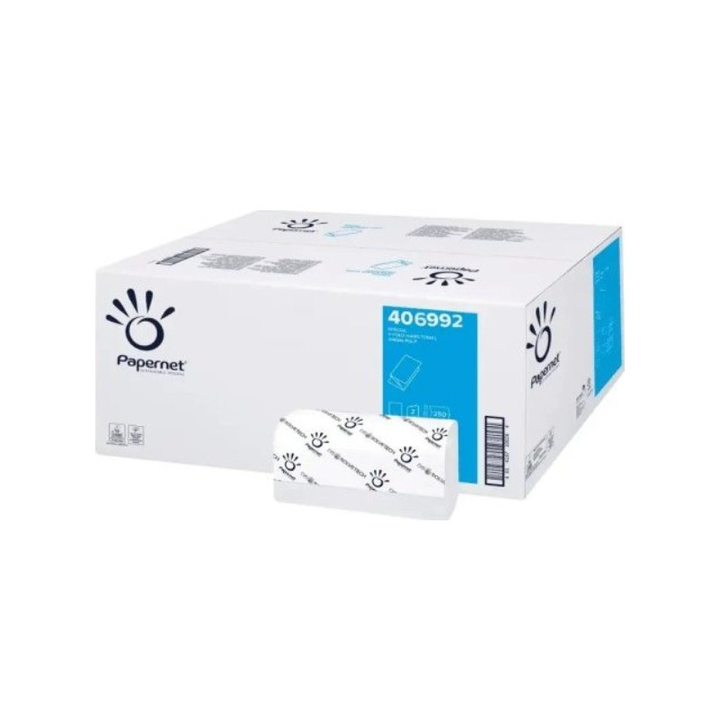 Papírové ručníky skládané, počet vrstev 2, délka útržku 21 cm, šířka útržku 24 cm, počet útržků 266 ks.