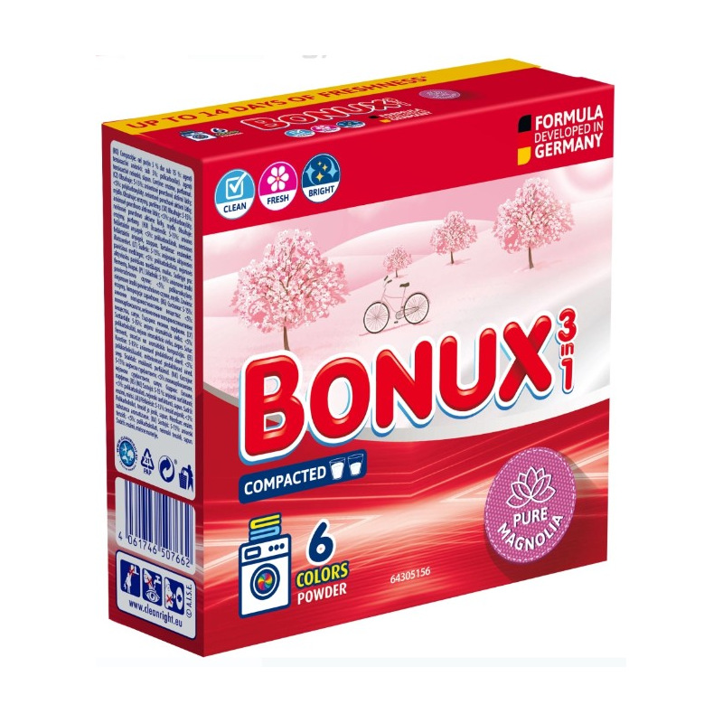 Prací prášek Bonux Color Pure Magnolia 3v1 obsahuje nové aktivní částice pro dokonalejší praní.