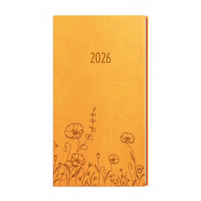 Kapesní týdenní diář v okrové barvě je vyráběný z jemné hladké vivelly s efektní ražbou s motivem Květin. Trendy a praktický doplněk do každé kapsy. Diář má velký prostor pro poznámky a plánování.