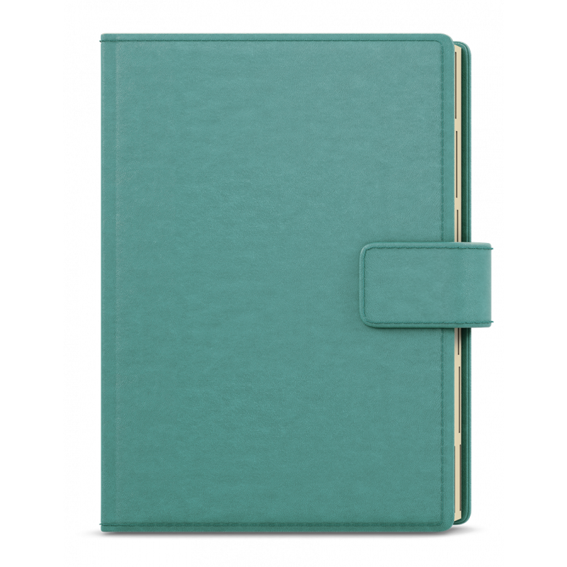 Elegantní týdenní diář ve formátu A5 se stylovým a znovupoužitelným obalem v tyrkysové barvě. Praktické vnitřní uspořádání nabízí množství přihrádek na vizitky, poutko na tužku a bezpečné magnetické zavírání. Diář bude působit luxusně a profesionálně – ideální volba pro práci, podnikání i osobní organizaci.