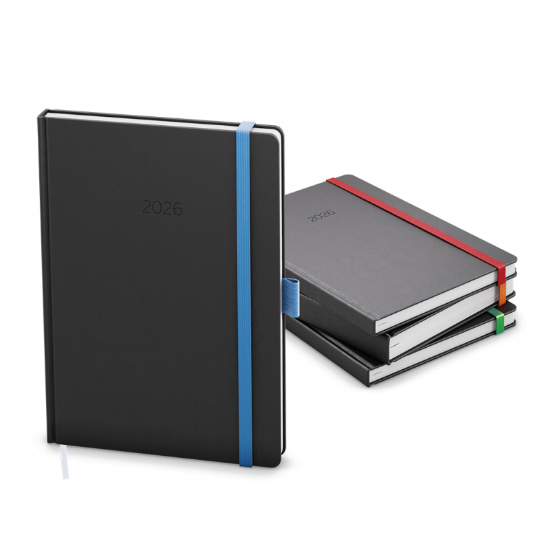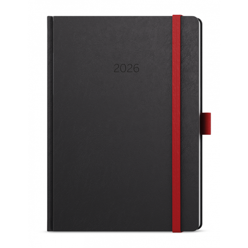 Neobyčejný týdenní diář s matným povrchem ze strukturovaného materiálu s červenou gumičkou a poutkem. Je vyráběný ve formátu A5, má velký prostor pro poznámky a plánování.