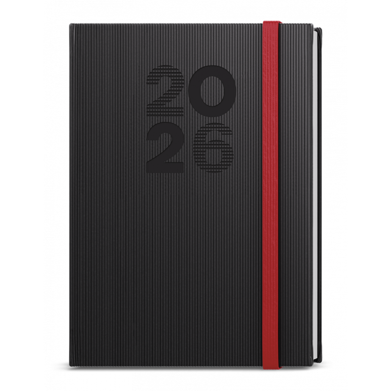 Týdenní diář formátu A5 vyrobený ze strukturovaného materiálu v černé barvě a s gumičkou. Oblíbená grafika vnitřního bloku Vám pomůže účelně plánovat Vaše dny.