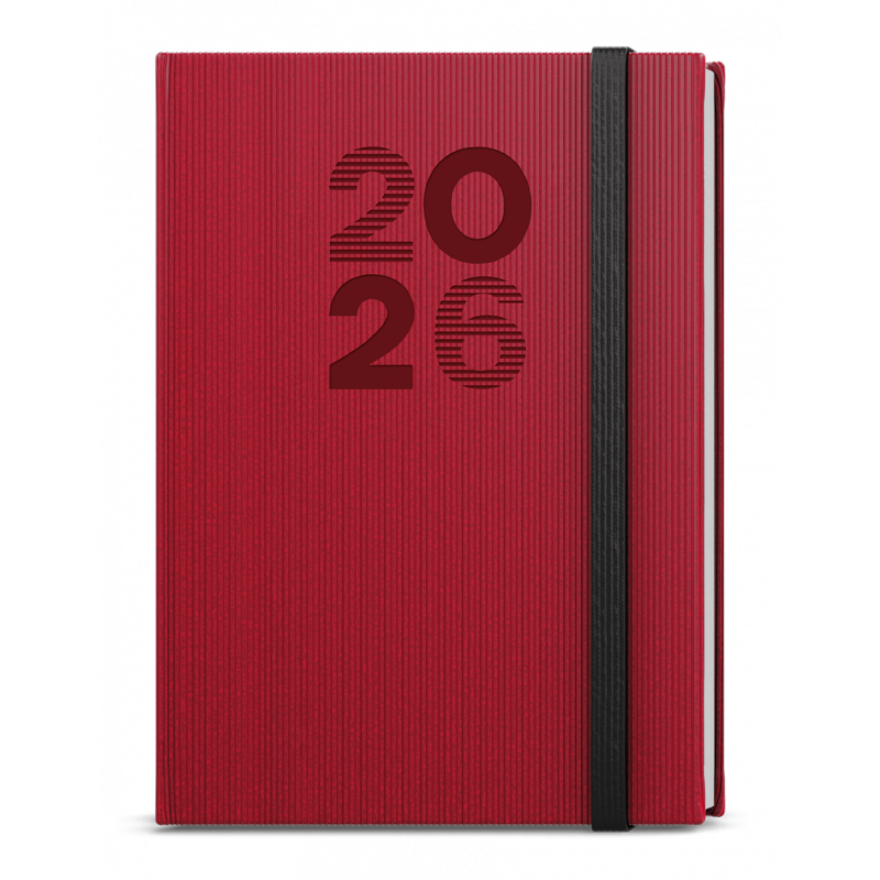 Týdenní diář formátu A5 vyrobený ze strukturovaného materiálu v červené barvě a s gumičkou. Oblíbená grafika vnitřního bloku Vám pomůže účelně plánovat Vaše dny.
