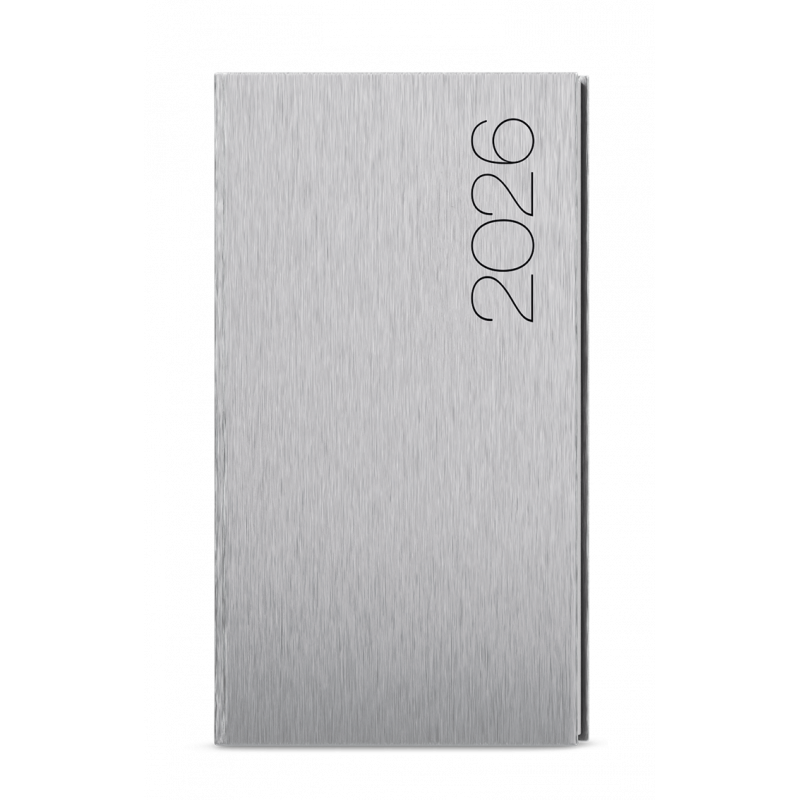 Kapesní týdenní diář v lesklé stříbrné barvě se strukturovaným povrchem. Moderní doplněk do každé kapsy. Diář má velký prostor pro poznámky a plánování.