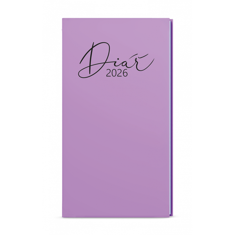 Kapesní týdenní diář v pastelově fialovém odstínu je potažený nepoškrabatelným matným laminem s parciálním lakem. Trendy a praktický doplněk do každé kapsy. Diář má velký prostor pro poznámky a plánování.